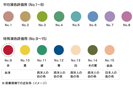 人体に近い色が含まれる特殊演色評価数(Ri)の赤色を示すR9値と、日本人の肌色を示すR15値の両方で指数99という高い数値を示す、超高演色な医療用LEDを採用。